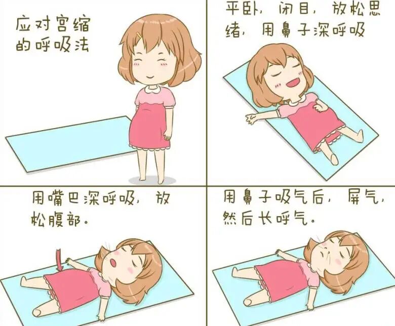 教给大家一种缓解宫缩的方法:首先,平卧,闭目,以鼻深呼吸;然后用口深呼吸放松腹部;最后以鼻吸气后,屏气,然后长呼气。